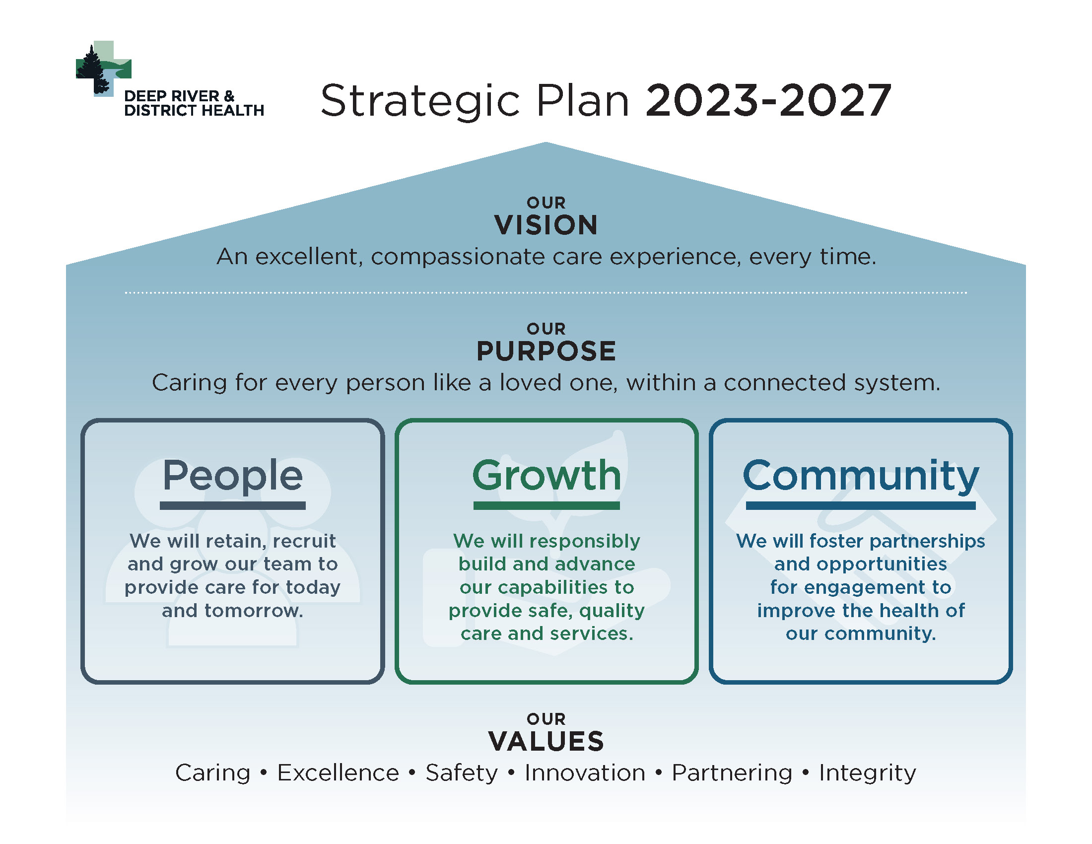 In this new plan, we will be guided by our values of caring, excellence, safety, innovation, partnering and integrity to ensure we are delivering excellent, compassionate care for our community. Together, as Deep River & District Health, we look forward to a bright future and building a healthier community.